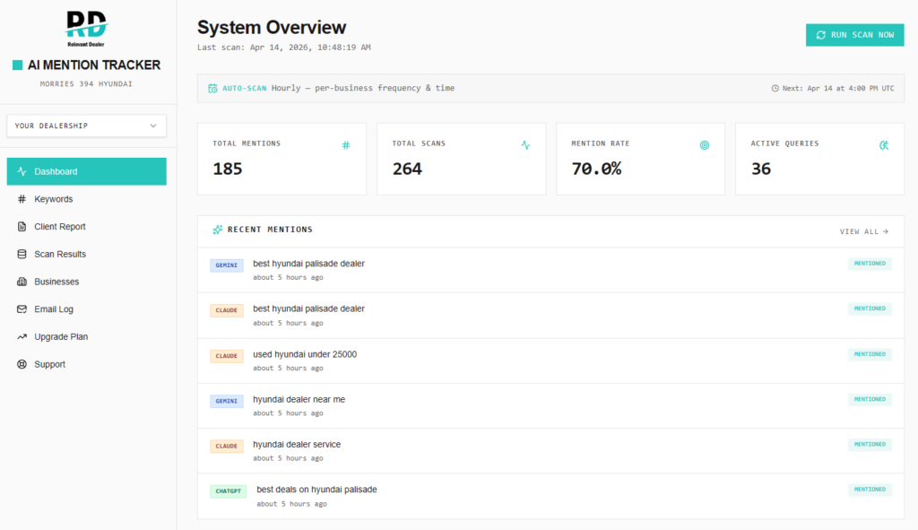 AI Mention Tracker is a platform built for automotive dealers that checks whether AI tools mention your dealership when asked relevant shopping and service questions. It simplifies thousand of lines of text into a simple comparable metric that is easy to understand.